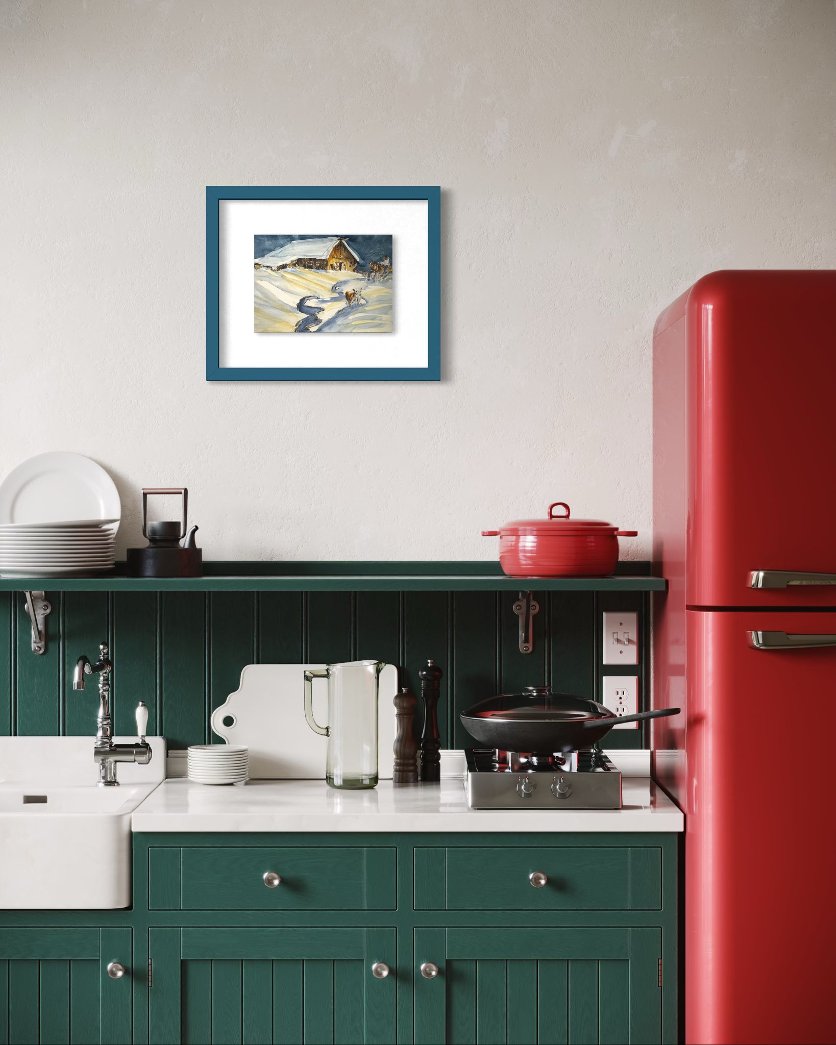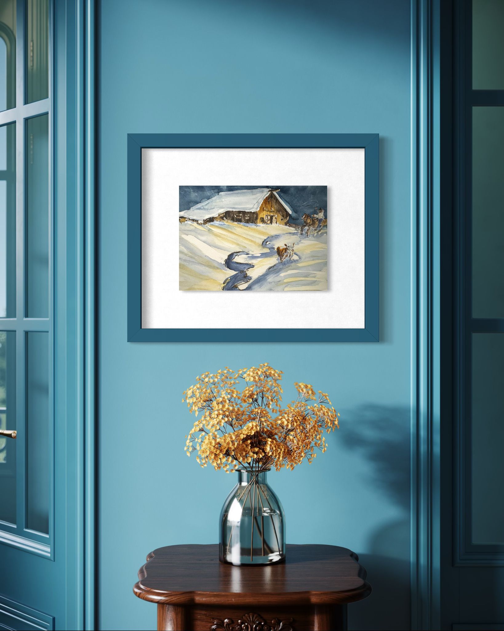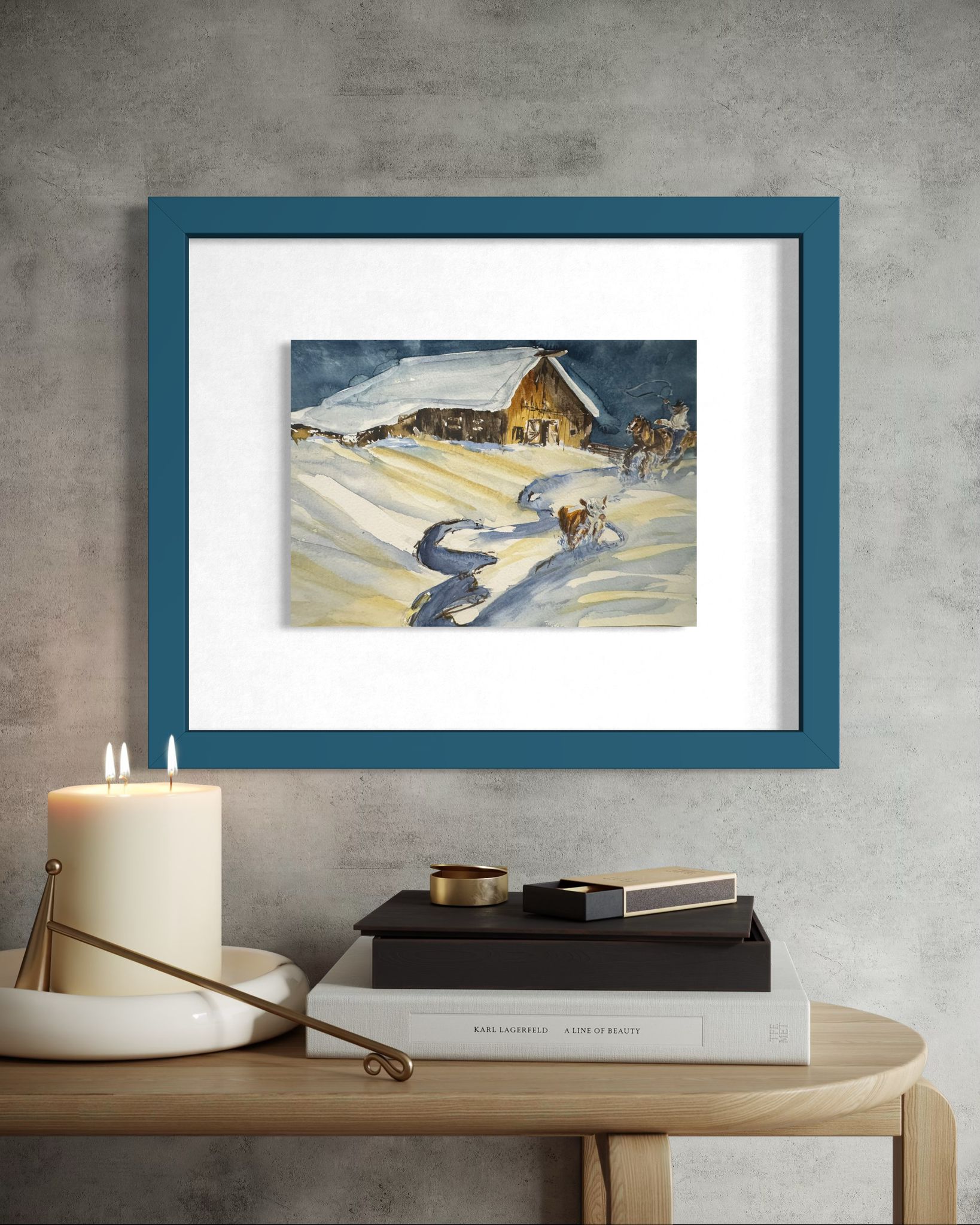 The scene captures a rider chasing a calf through fresh snow, with a rustic barn glowing warmly in the background. Through quick brushwork and fluid washes, I tried to express both the dynamism of the chase and the tranquil stillness of winter light.