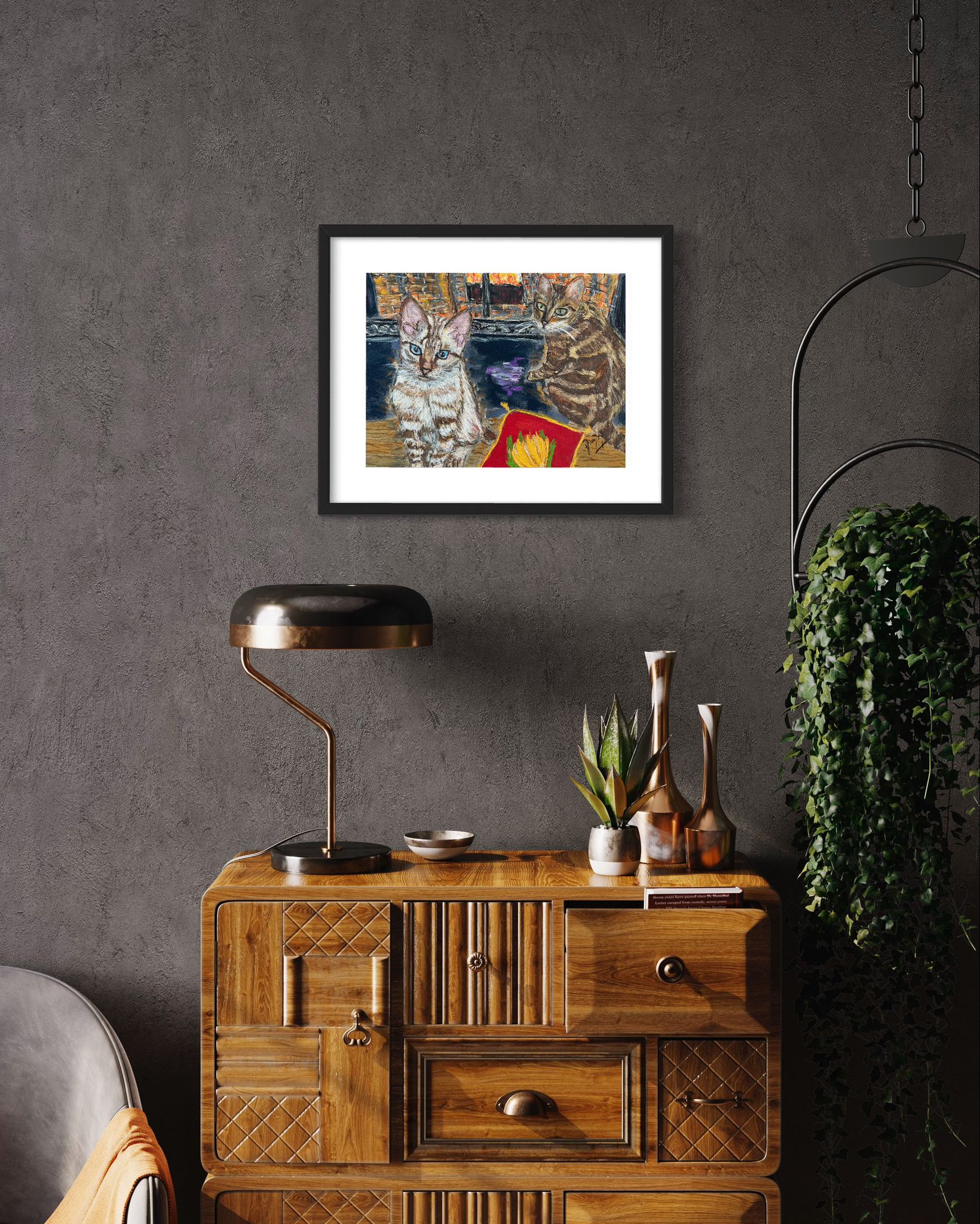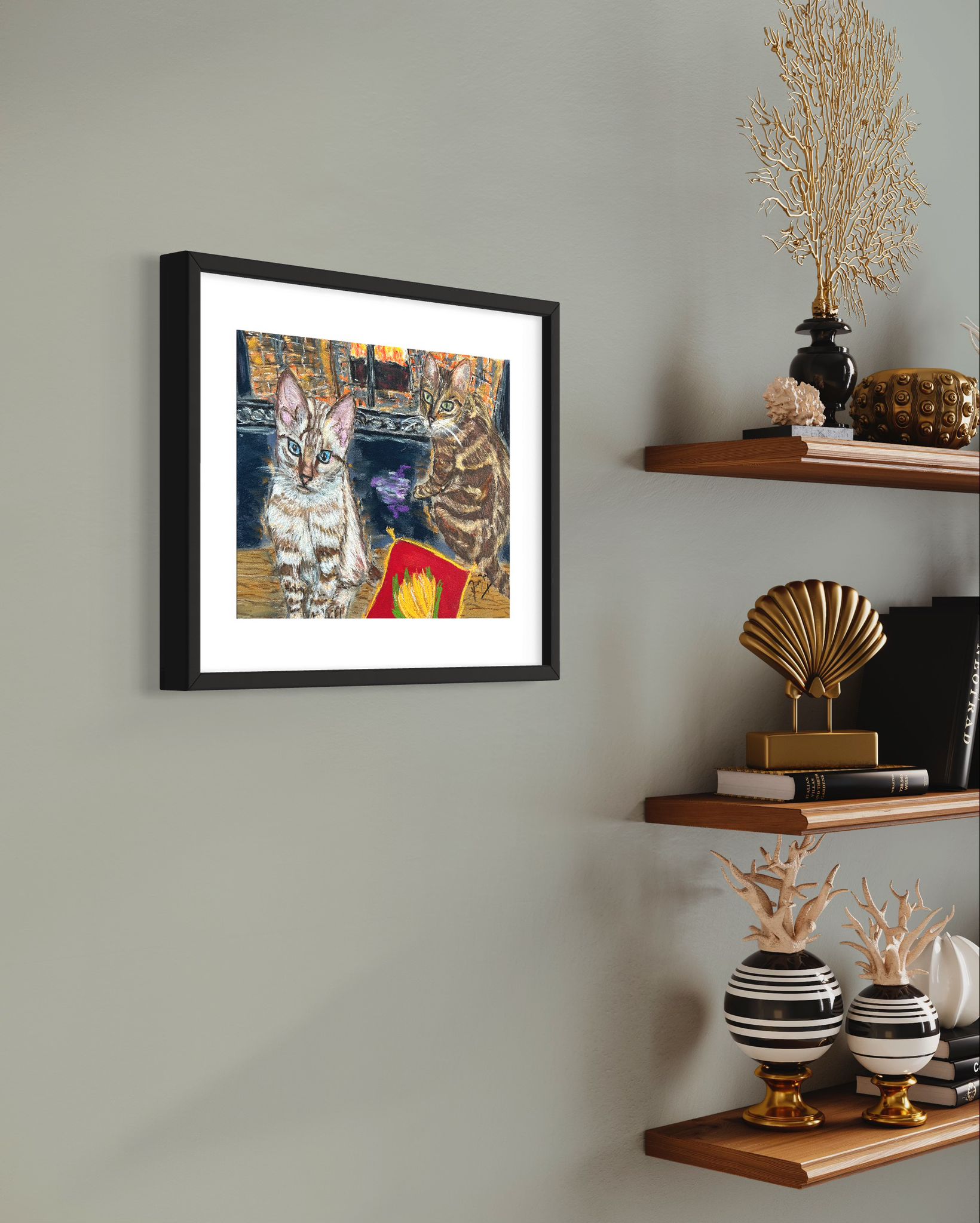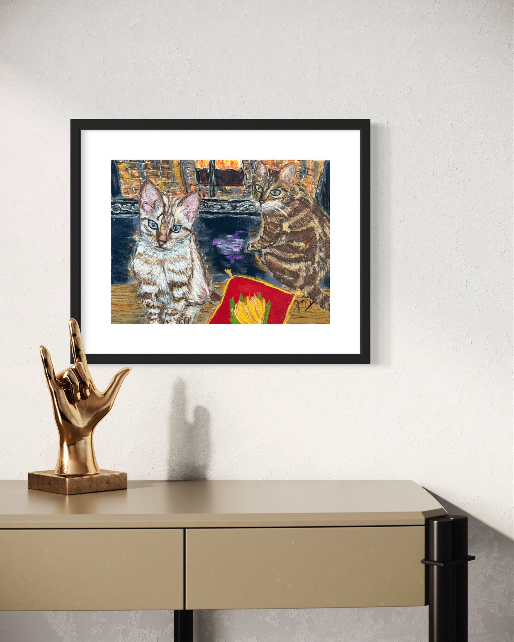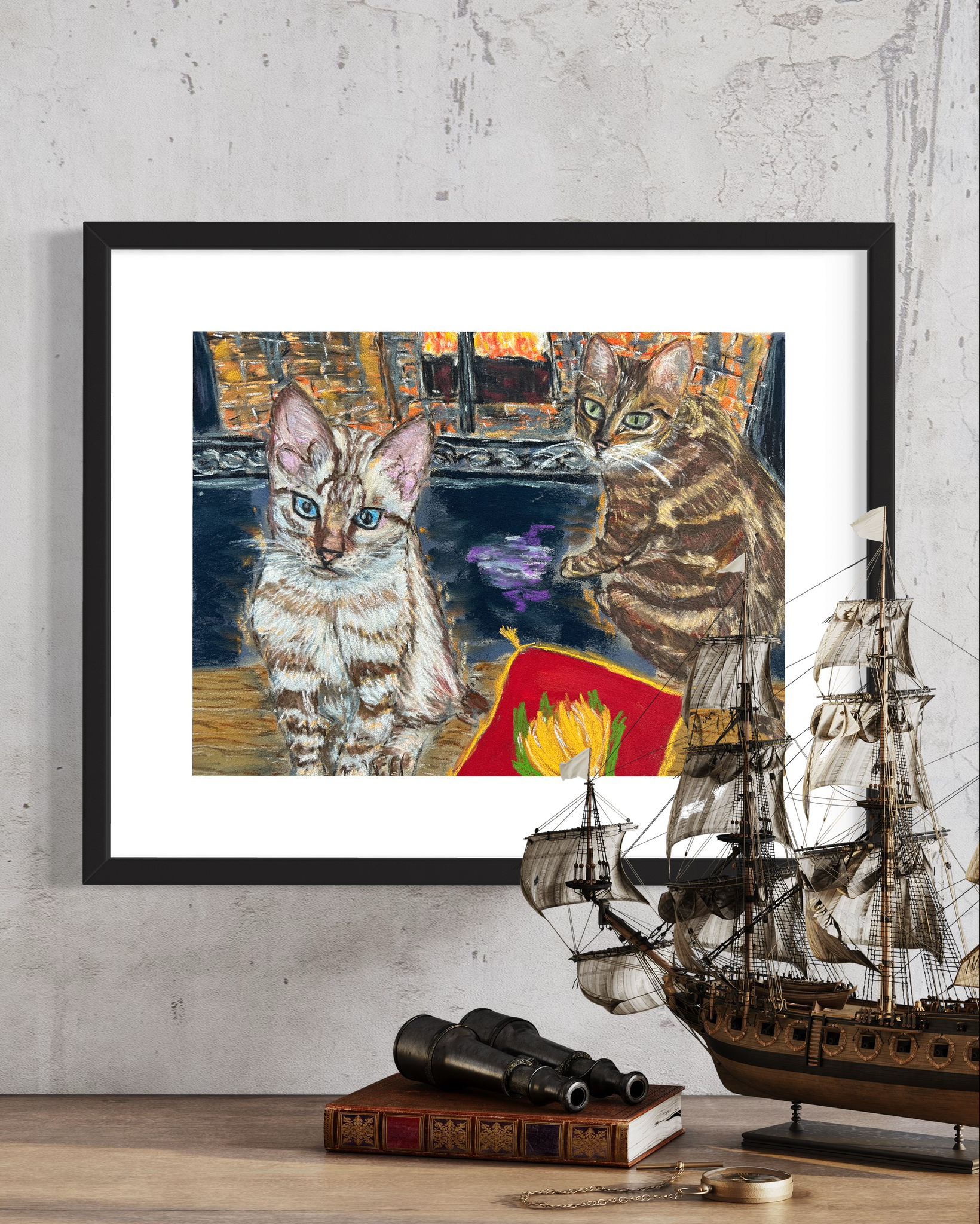 A new commission of a pair of bengal kittens by the fireplace. I do not naturally paint cats, but an art collector of mine started asking me to do so. This is for another client, that she loved the kittens before, and asked me a pet portrait. I have chosen the background of the picture and how I put the two cats, chosen for multiple pictures.