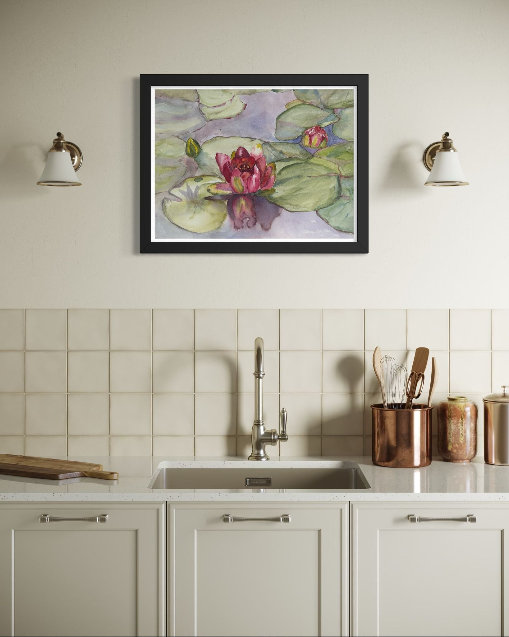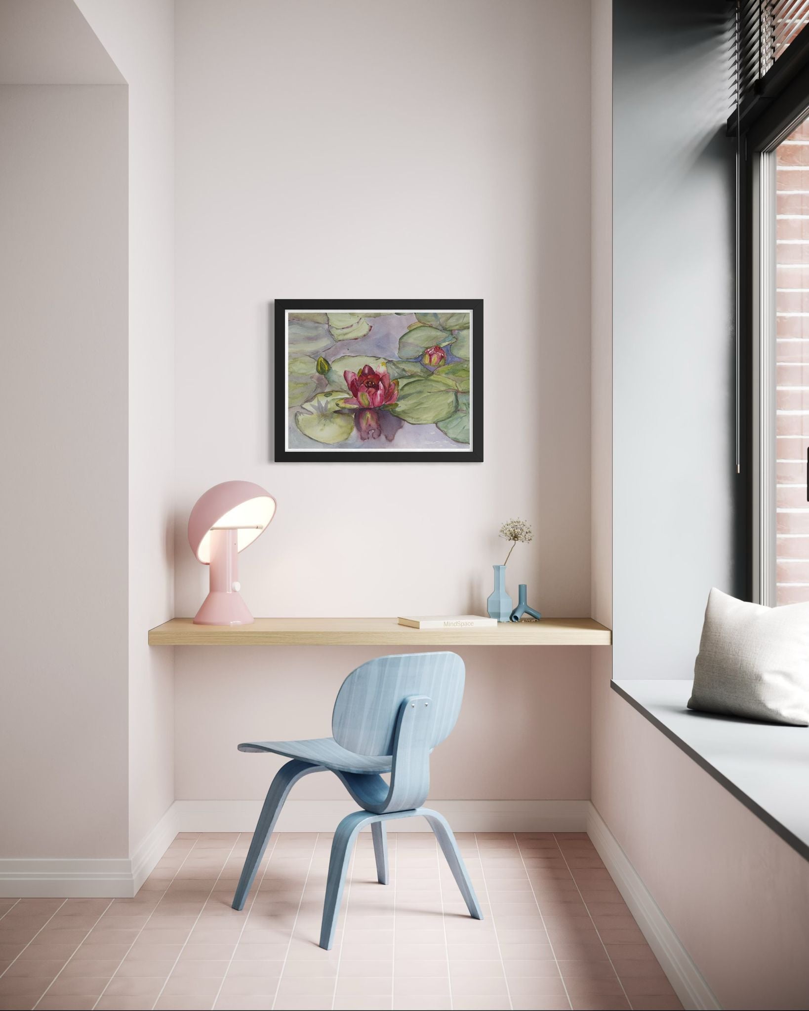 Working with transparent washes and layered colour, I focused on capturing the softness of the petals, the variation within the deep pink bloom, and the calm reflections across the surface of the water. The gentle movement of the lily pads brings a sense of tranquility, while the play of light creates subtle depth throughout the composition.