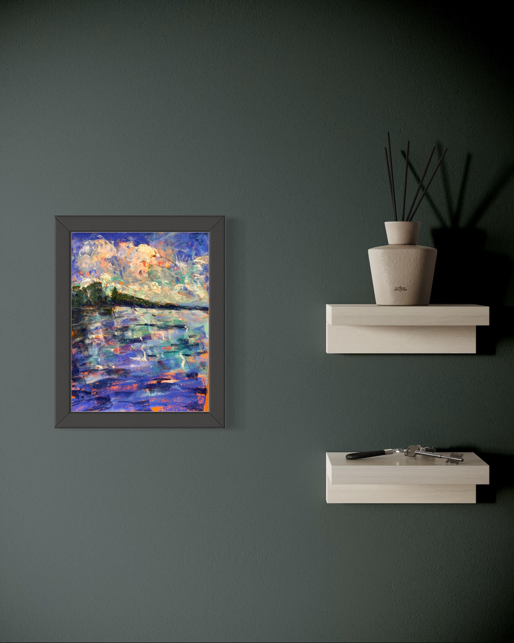 Created during Alain Picard’s Landscape Week, this pastel painting captures the brilliance and vibrancy of midday light. The sky is alive with swirling clouds in shades of peach, turquoise, and violet, mirrored by the shimmering surface of the water below. Bold strokes of orange and blue convey both the intensity and movement of the scene, evoking the energy of a summer day at its brightest.