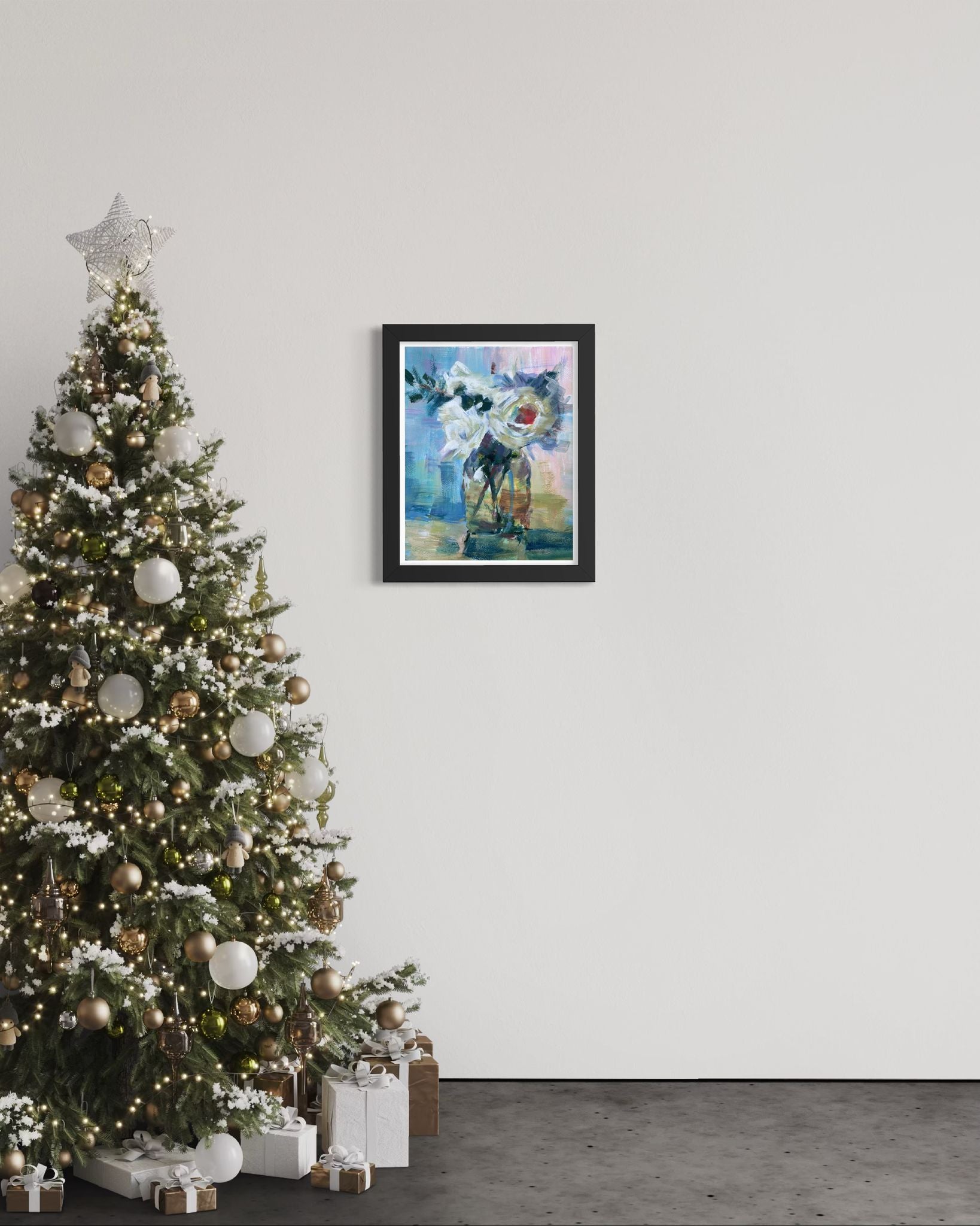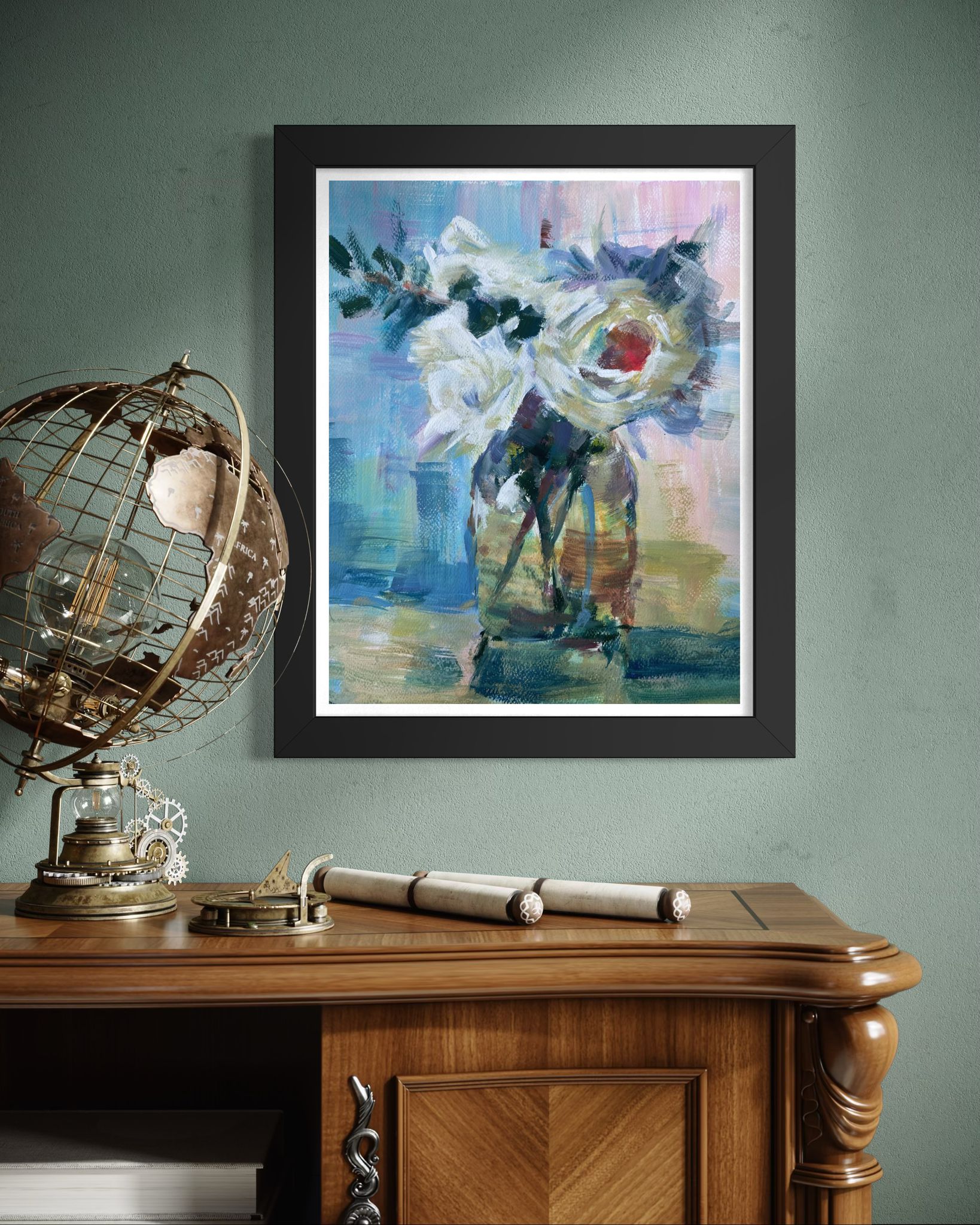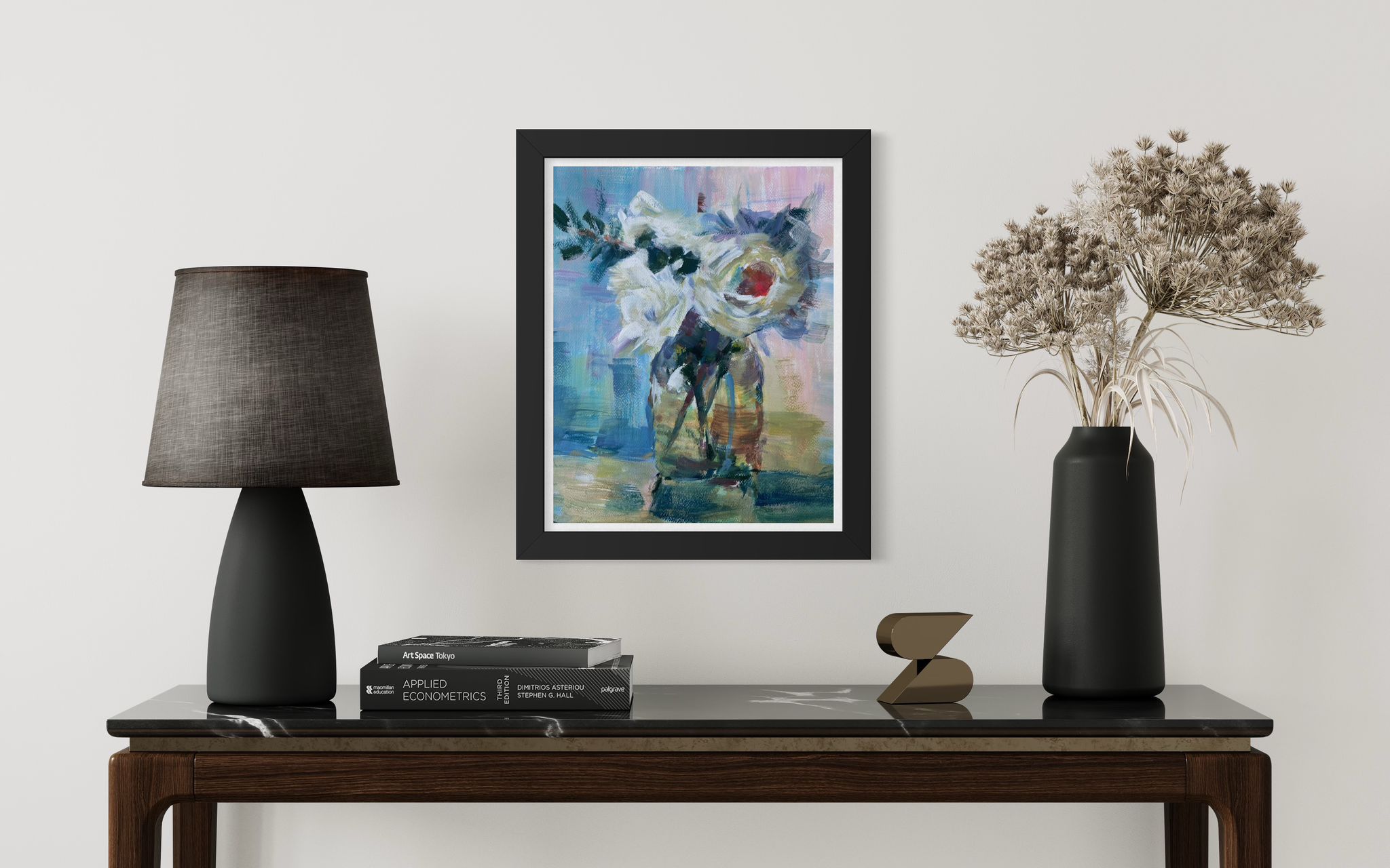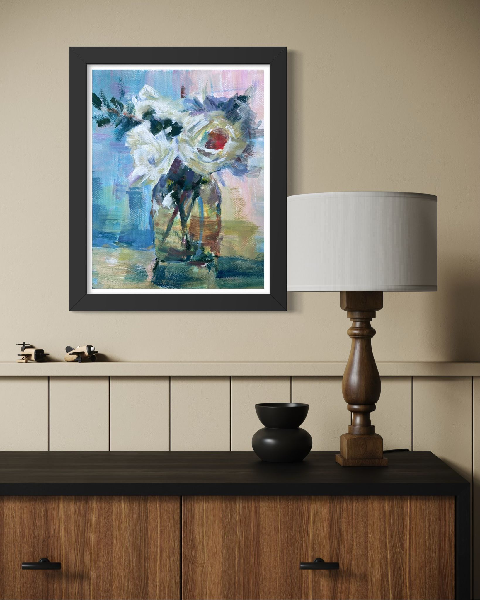 Working with acrylics and gouache, I explored loose mark-making, bold colour shifts, and the interplay of light across the petals of white roses arranged in a simple glass vase.