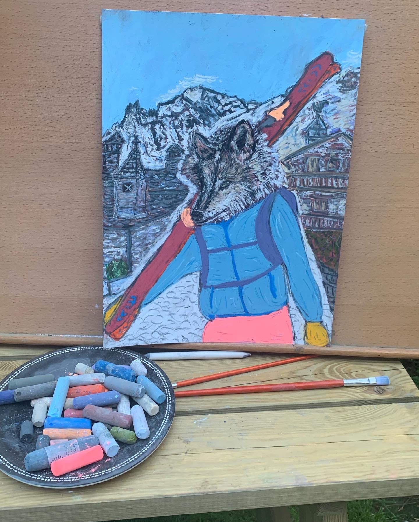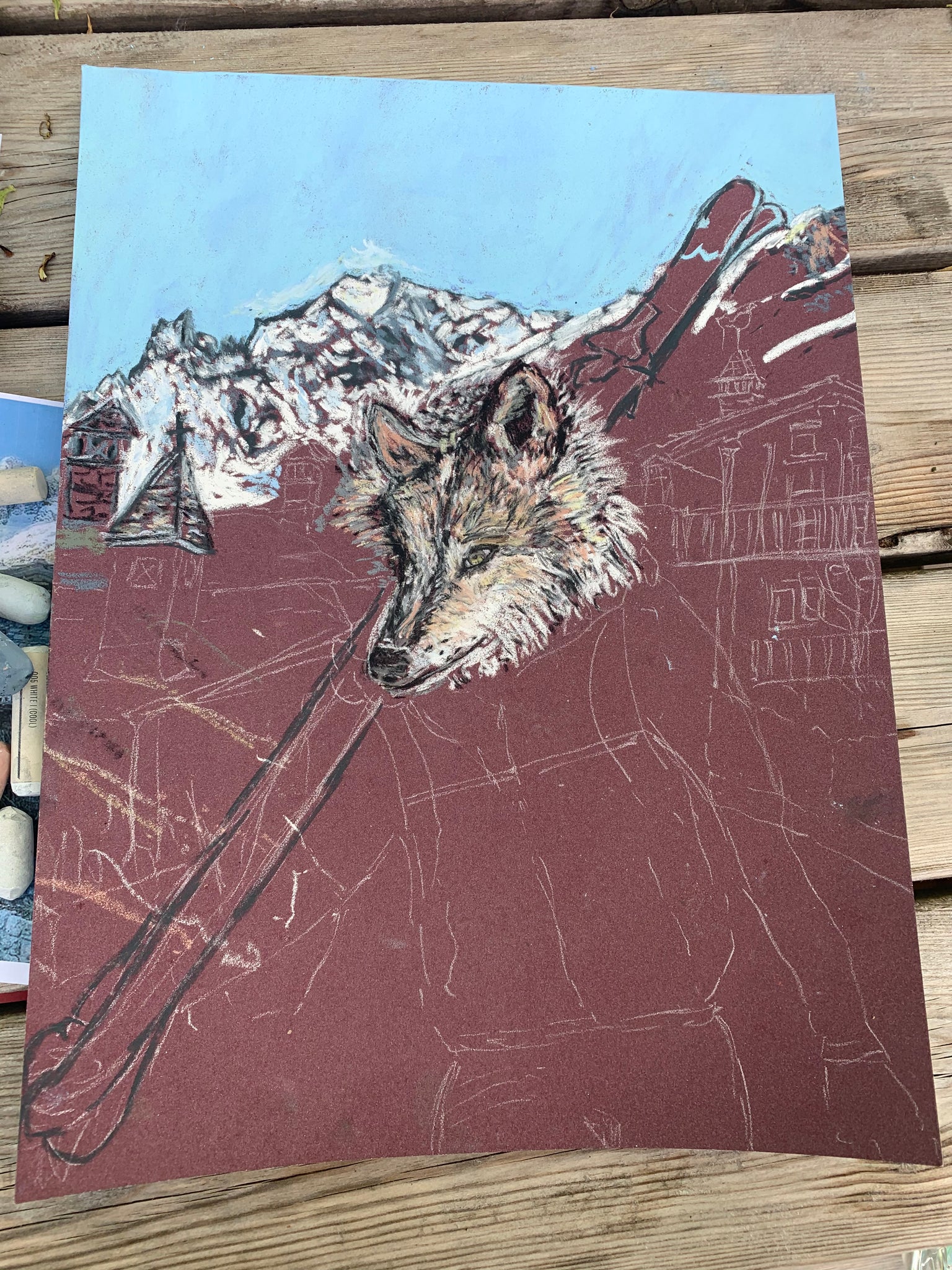 A painting done on Pastelmat paper 30x40cm of a wolf dressed as a skier and carrying skis in the hamlet of Entrèves, that is near the Mont Blanc Tunnel and the two lifts that go up the mountain: the Skyway Monte Bianco- that takes you to Punta Helbronner, and Funivia Monte Bianco, that takes you up to the Val Veny area of the ski resort of Courmayeur. The painting was done with Unison and Sennelier pastels and Faber Castell's Pitt Pastel Pencils. Framed.